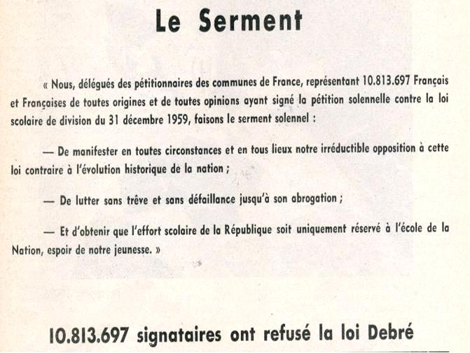 Rappelons que c’est l’attaque de la loi Debré de 1959 et la réaction qui s’en est suivie par la pétition de 11 millions d’électeurs réclamant son abrogation, le Rassemblement à Vincennes des 300 000 Laïques et le Serment de Vincennes qui ont été fondateurs du Mouvement laïque en France.